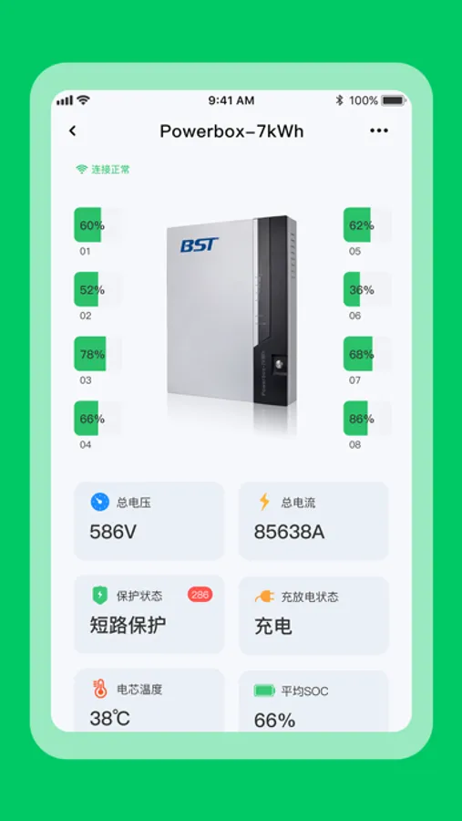 After connecting the Bluetooth + WiFi module of the corresponding BST product, you can view the total voltage, total current, SOC, SOH, maximum cell temperature, minimum cell temperature, maximum cell voltage, minimum cell voltage, cycle times, current system alarm information and detailed cell information of the corresponding battery system. Engineers can view the threshold of system parameters, modify the threshold of system parameters, and control the switch of charge and discharge. A module can correspond to up to 8 battery systems, distinguished by address.