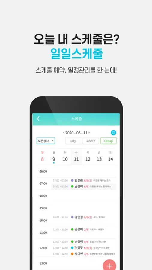 담당하는 회원의 개인수업 및 그룹수업 스케줄을 미리 예약하거나 회원의 출결 내역을 쉽게 관리할 수 있습니다.