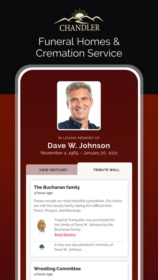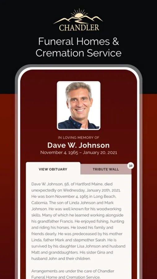 The Chandler Funeral Home & Cremation Services Family app combines and simplifies sharing of your loved one’s passing with family and friends. In the app, you can track and share dates and times of services and other events, view tributes and see photos from those who post to the obituary page. Sharing allows you to send one message with a link to all the contacts you choose in either a text message or an email.