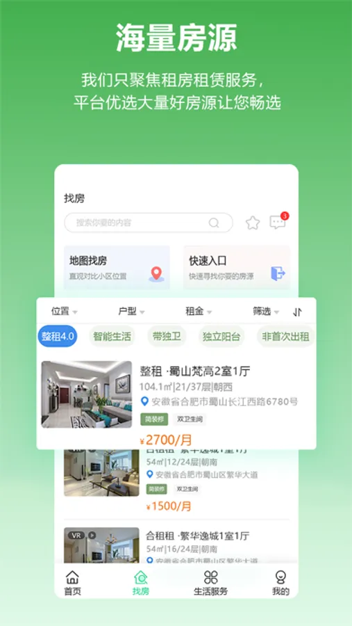 「海量房源」:携手找房,我们只聚焦租房租赁服务,平台优选大量好房源让您畅选
