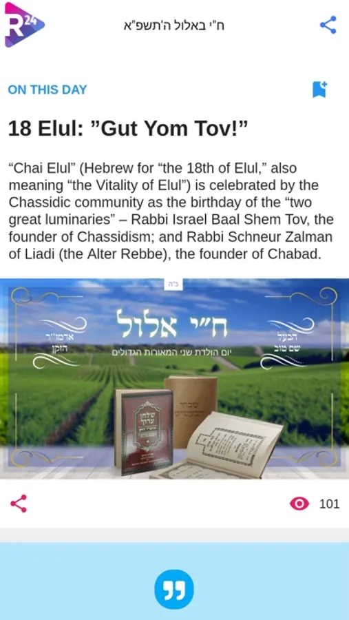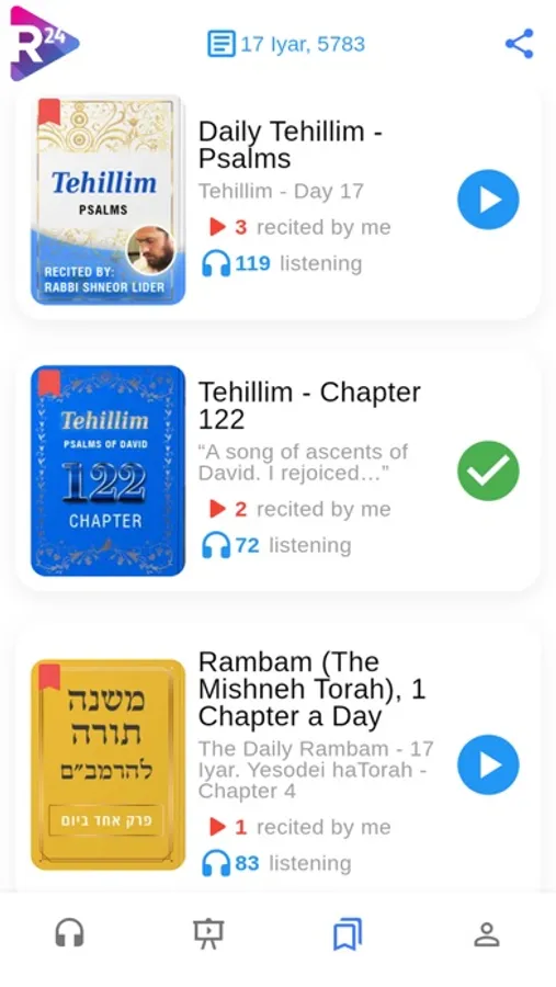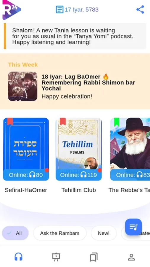 Would you like to have a Torah class while driving? Yes, with the R24 app you can listen to the Torah portion, have a Tania lesson, recite the daily Tehillim chapters, listen to the Rebbe's talks (and other books) even on the go. A whole Jewish library for your daily Torah study is now streaming for you on R24 - in any place where you can say the words of the Torah.