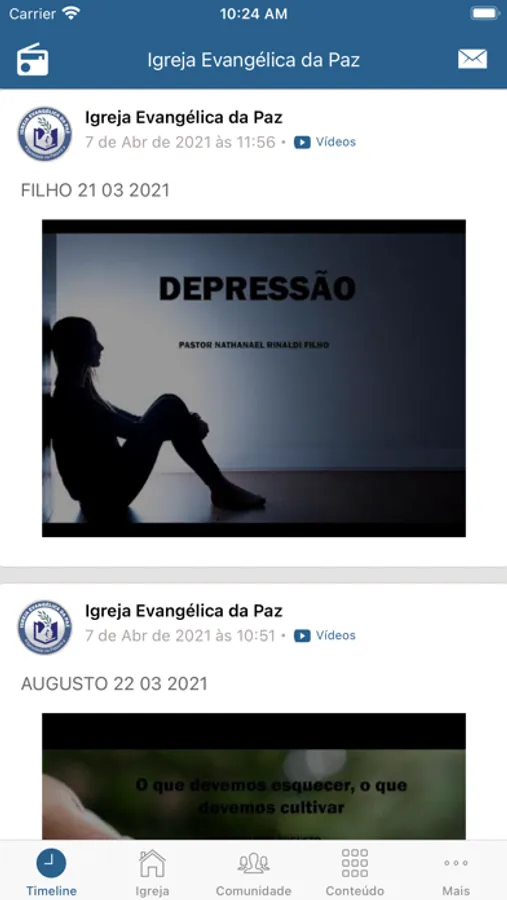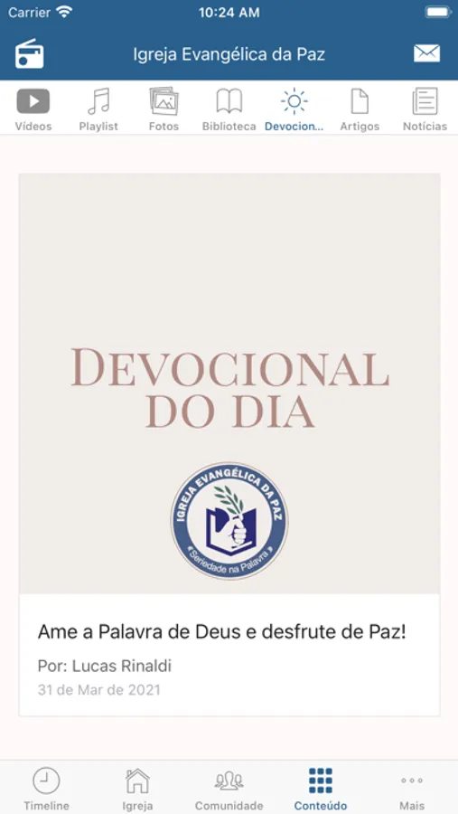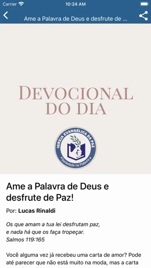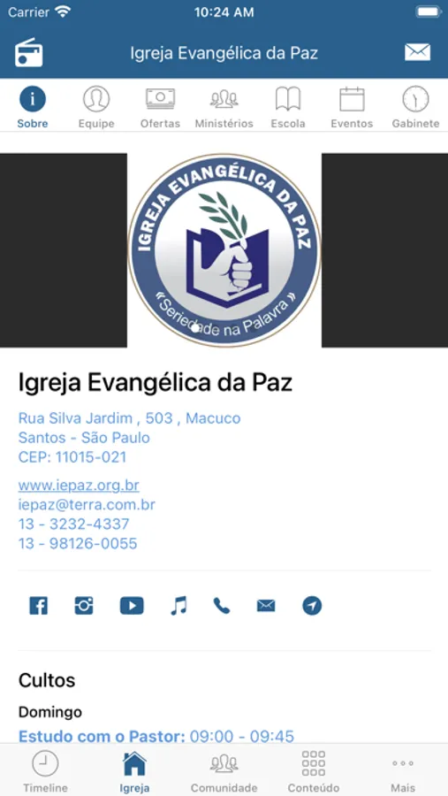 - Informações da Igreja (endereço, telefone, site, redes sociais, pastores)