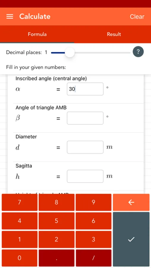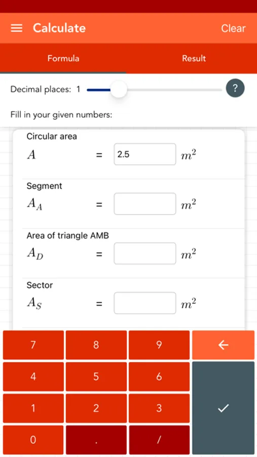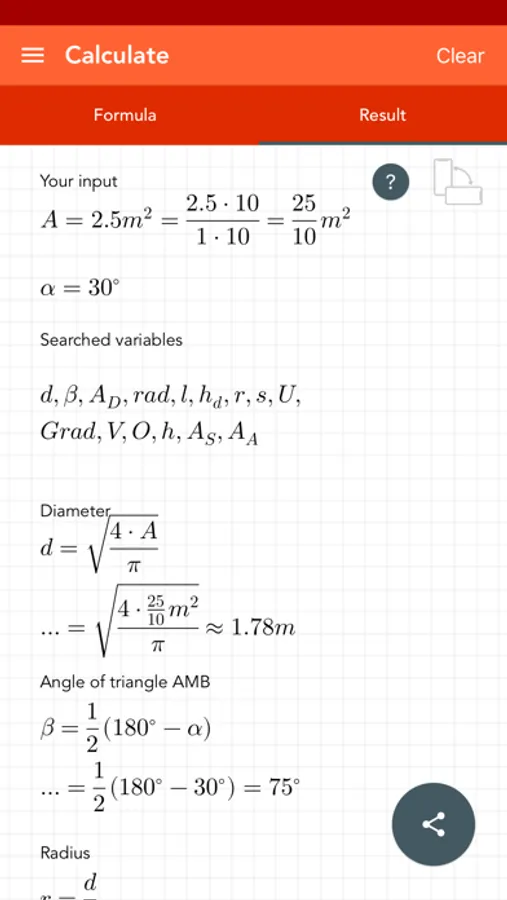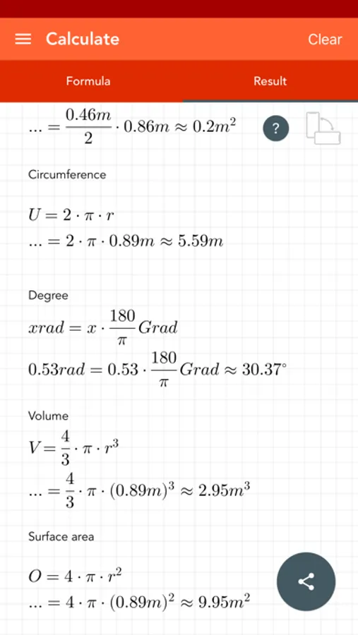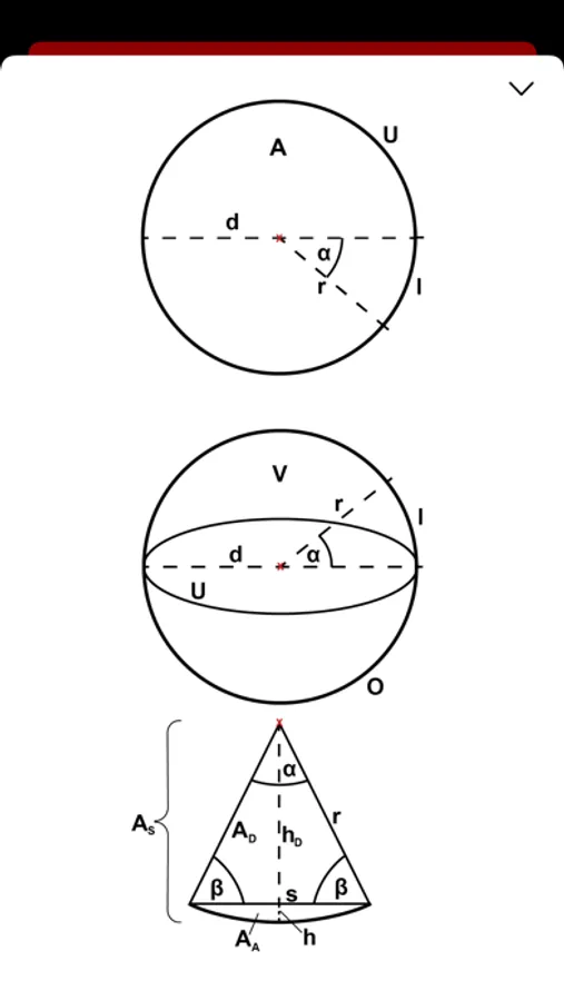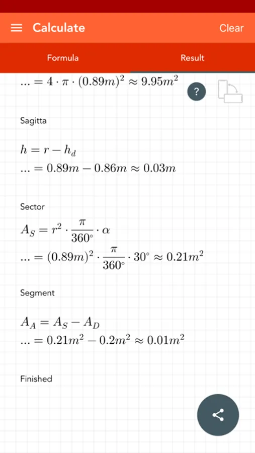 This app calculates all quantities of a sphere (body of a sphere, circle, all parts of sector and segment). Therefore you must enter some variables (like the radius of a circle and the central angle). The algorithm searches the formulas of the missing quantities, shows them and calculates the results.