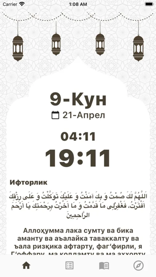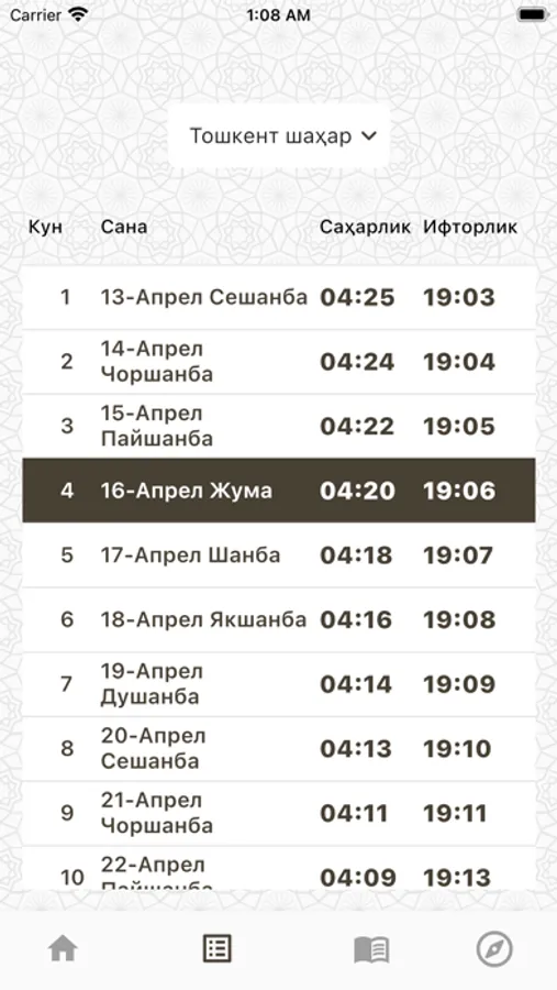 Ramazon taqvimi ramazon oyida og'iz ochish va yopish vaqtlarini ko'rishda va qiblani topshda foydalanishingiz mumkin