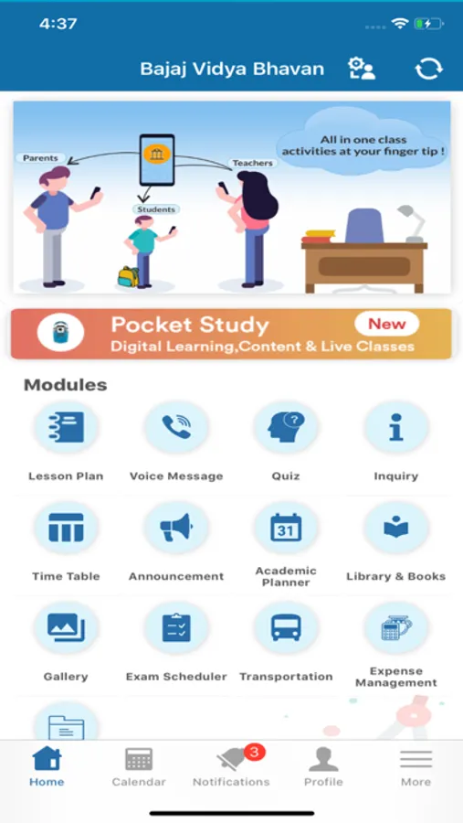 A Pool between Student, Parent, Teacher & Admin :Online tests, spot results, Calendar, Live notice board, discussion and many more..
