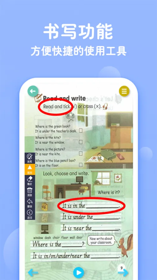 【4】画笔功能,全屏涂鸦让学习更加的有趣让学习更加高效率。完全同步最新发行教材,绝无缺漏页现象。