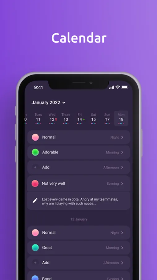 1. **Mark your mood**: Keeping a journal has therapeutic effects on its own, record your mood to better understand your emotions and track your well-being in time.