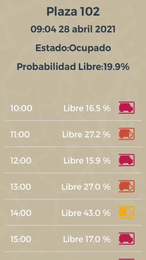 Desde el apartado predicciones es posible consultar la estimación del estado de ocupación de las plazas sensorizadas para las próximas horas, permitiendo así una mejor planificación de los desplazamientos con vehículos a determinados puntos de la ciudad.