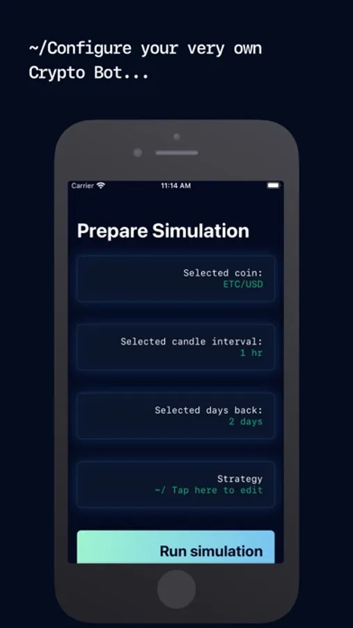 Once your strategy is finished you can select the crypto currency, candle interval and start time to run your simulation.