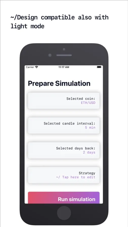 Coiner will back-up every previous simulation in your device's memory for later access! All backed-up simulations will show a very intuitive summary of what triggers were used, when, on which crypto, on what candle interval. And if you want to further inspect that simulation, you are always free to re-run it!