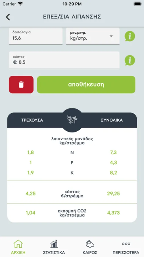 • Λιπάνσεις, αρδεύσεις, καλλιεργητικές εργασίες (μοναδιαίο και συσσωρευτικό κόστος και αυτόματος υπολογισμός ανθρακικού αποτυπώματος)