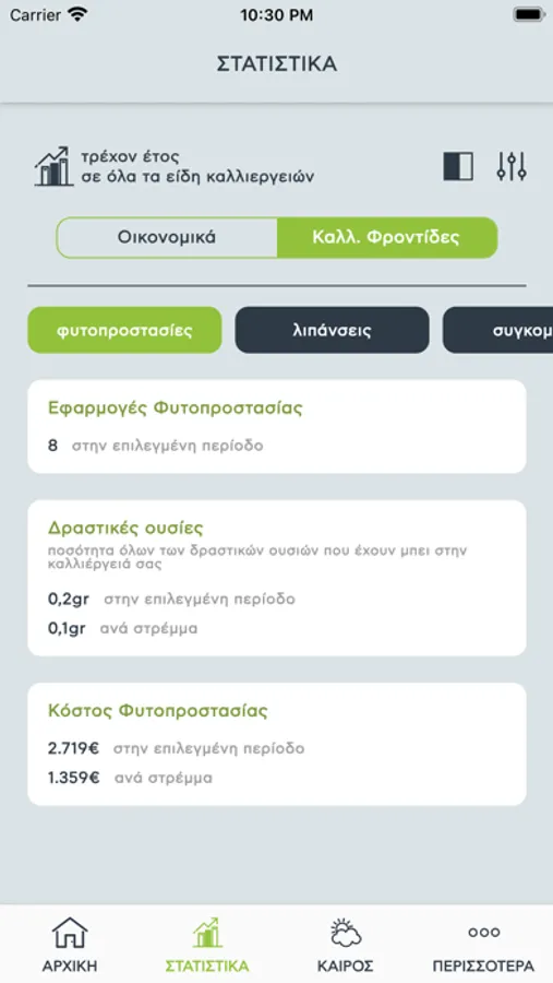 • Είδος, αριθμός και ποσότητα ψεκασμών με πλήρεις καταγραφές (ημερομηνία, τόπος, συσχέτιση με δεδομένα καιρού, μοναδιαία και συσσωρευτική αποτύπωση κόστους και αυτόματος υπολογισμός ανθρακικού αποτυπώματος μοναδιαία και συσσωρευτική)