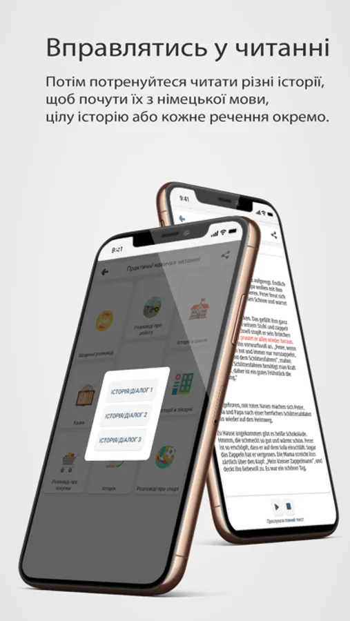 Потім потренуйтеся читати різні історії, щоб почути їх з німецької мови, цілу історію або кожне речення окремо.