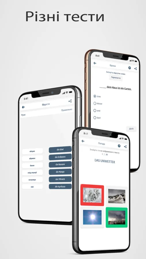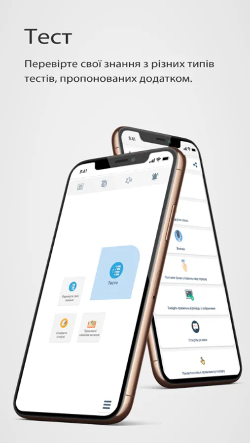 Перевірте свої знання з різних типів тестів, пропонованих додатком, таких як: поєднання слів з однаковим значенням, пошук правильної відповіді на малюнку, переклад слова або речення, прослуховування речення, а потім написання, вимовляння речення, що з’являється і інші.