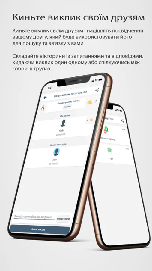 Створіть виклик і надішліть посвідчення своєму другові, який використає його, щоб знайти вас і зв’язатися з вами. Створюйте вікторини із запитаннями та відповідями в рамках викликів та кидайте виклик одне одному або спілкуйтесь між собою в групах.