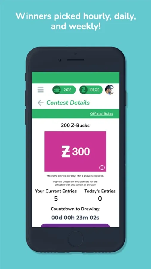 Simply sign up, pick a mode and go! Games include speed solitaire, word search, and Wordology. Or, answer trivia questions to rack up tickets towards the hourly contest. Every hour the tickets are tallied up and a winner is picked earning them Z-Bucks!
