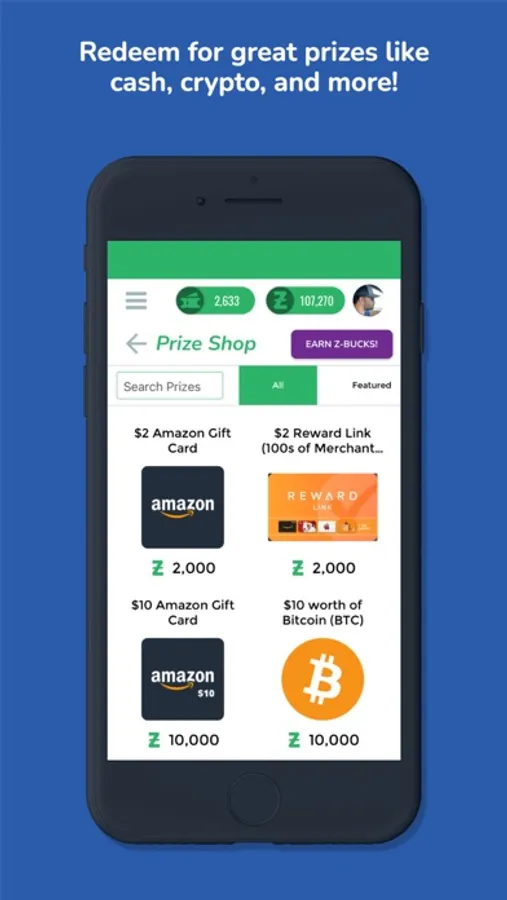 Earn enough Z-Bucks to redeem prizes in the Prize Shop such as gift cards, Bitcoin, Dogecoin, Ethereum or even cash (via PayPal).