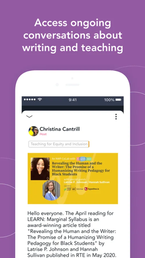 The Write Now Teacher Studio is open to all teachers with an interest in writing and teaching writing and is made possible through the National Writing Project (NWP), a national network of teachers focused on the teaching of writing, K-university and across the disciplines. NWP is a US-based national nonprofit that focuses the knowledge, expertise, and leadership of our nation's educators on sustained efforts to improve writing and learning for all learners. NWP believes writing in its many forms is the signature means of communication in the 21st century and works toward a more equitable future where every person is an accomplished writer, engaged learner, and active participant in a digital, interconnected world.