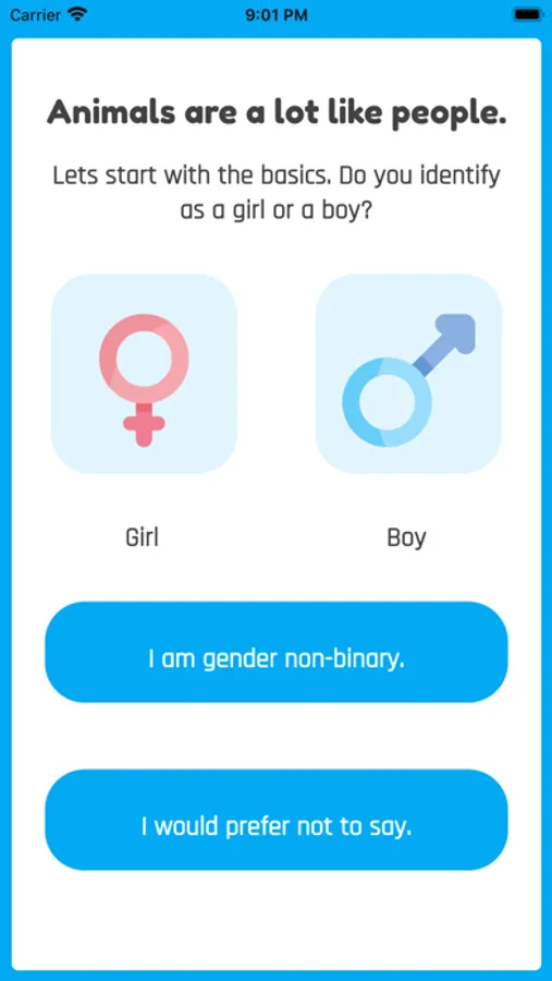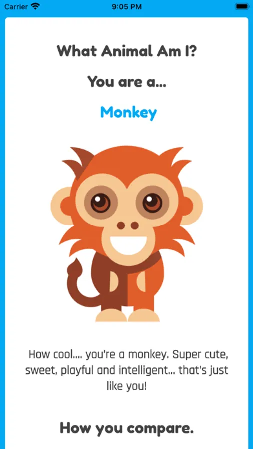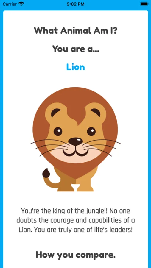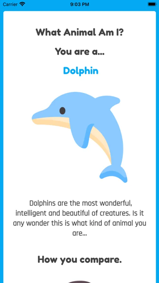 Answer some fun questions about your personality and appearance and this app will calculate what animal you are from nearly fifty different options including the fox, cat, shark, dolphin, eagle, elephant, tiger, lion, penguin, zebra and many more.