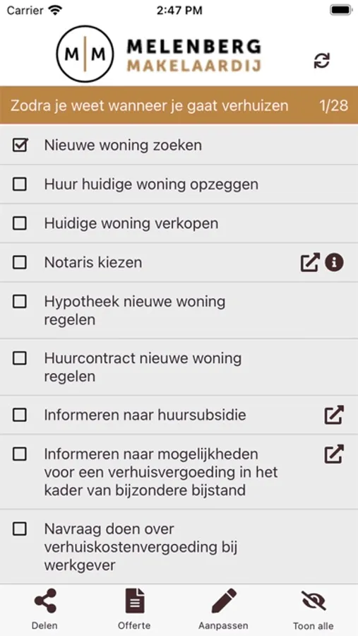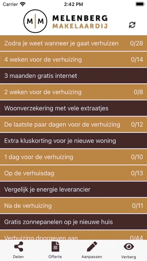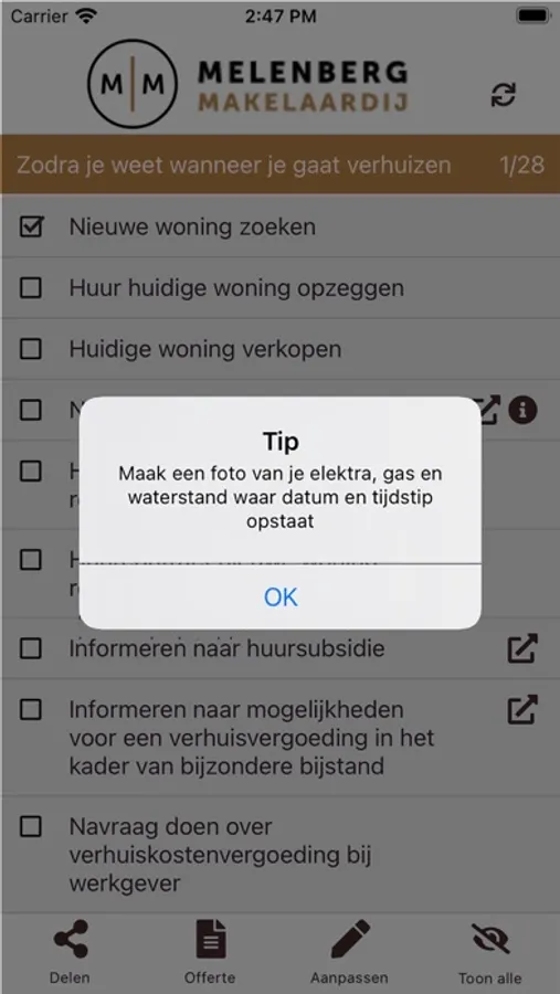 Tijdens alle fases van je verhuizing weet je daardoor precies wat je moet doen en kun je zelf ook taken toevoegen, naast de handige taken en aandachtspunten die de app al voor je aangemaakt heeft, waaronder: