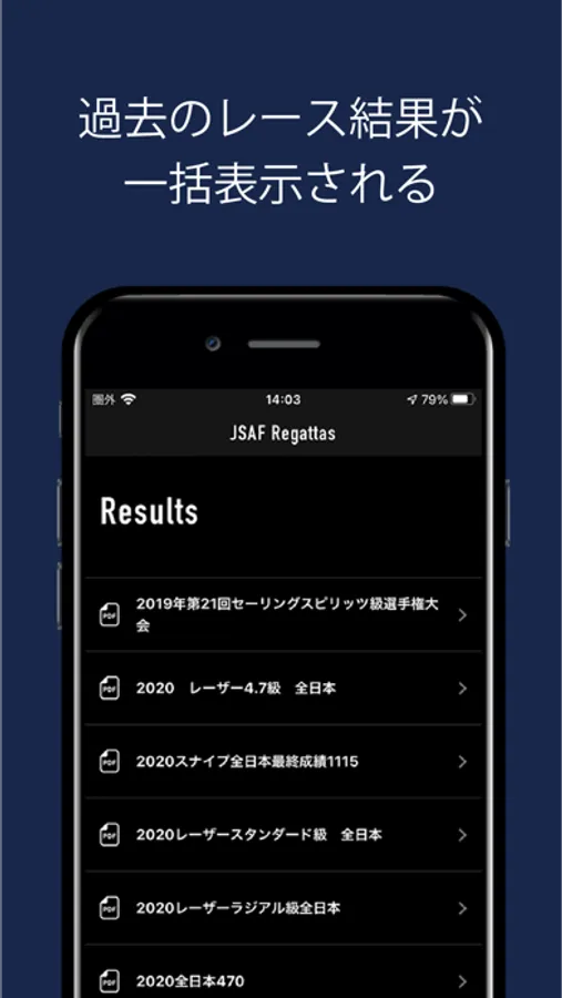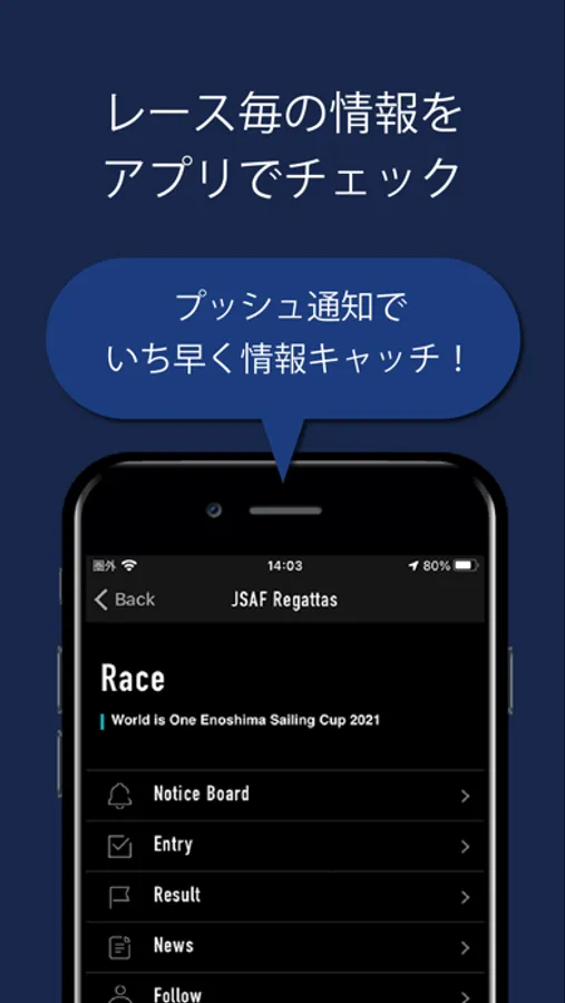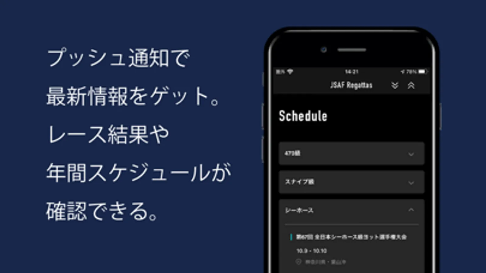 「JSAF Regattas」はこれらの課題を解決します。大会情報をアプリ一つで管理できるため、複数のツールを使う必要がありません。また、大会期間中も公式掲示板に集まることなく、どこにいてもスマートフォンひとつで情報収集できます。