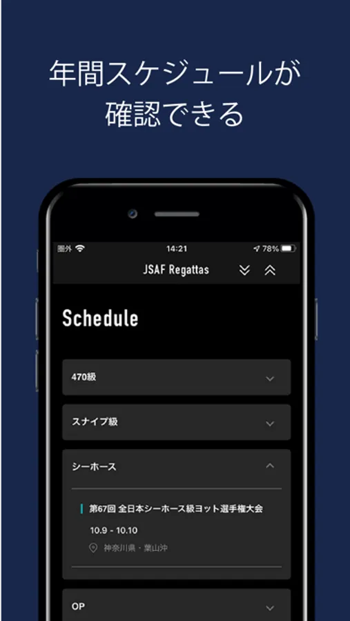 過去の成績確認や一年を通した大会スケジュールを確認できます。