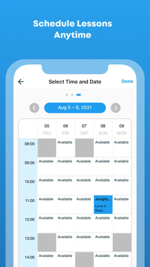 2. Flexible scheduling: book lessons easily using the mobile calendar feature. Lessons are available from 7am - 11pm Korea standard time.