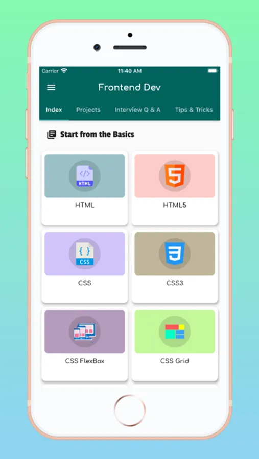 This app gives you a unique experience and focuses on front-end web development. First, we will get professional and free web development tools, then we will start with HTML. Once we cover this ground, we will take down our very first challenge. Further, we will learn HTML5 and start our first project.