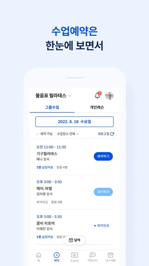 언제 어디서나 스마트폰에서 원하는 시간에 수업을 간편하게 예약하는 물음표 필라테스.