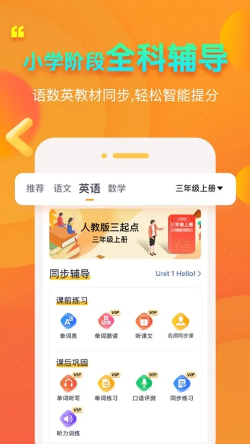 教材版本:全国通用的人教部编版1-9年级,与最新教材同步辅导,内容分单元学习,内容制作精细化;