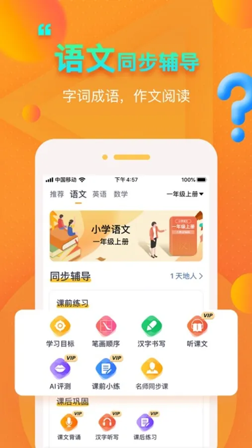 同步辅导的内容还包括:AI普通话评测,课前练习及课后练习,课文背诵,汉字听写,名师同步视频课,单元测试,错题本,生字本等等;
