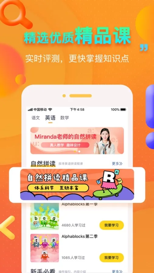 专项特训:本部分包括互动国际音标学习,自然拼读闯关,常用口语,单词分类,查单词,单词自测,阅读训练等;