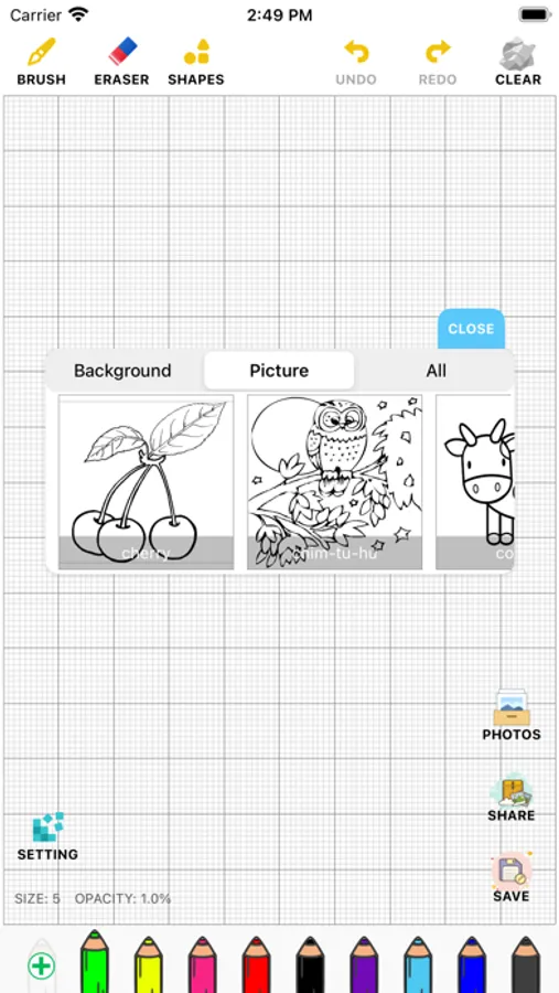 * Bạn hoàn toàn có thể tải các bộ tranh ảnh nhiều tình tiết trên mạng chuyển vào trong app để các bé tô vẽ, tập viết thoải mái.