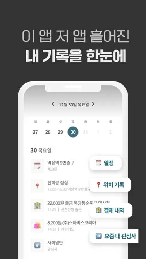 스케쥴,지출,장소 등 흩어져있는 내 일상기록을 한 곳에 모아드려요