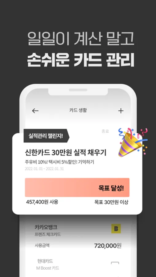 카드생활 챌린지를 통해, 특정금액 이상/이하 도달 목표를 세워 카드별 목표 실적달성과 절약소비습관을 동시에 관리할 수 있어요.