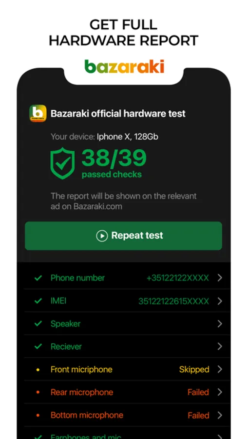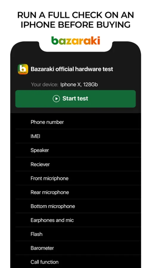 Attach a full report to sell your iPhone faster using Bazaraki.com phone check app. We can help you with buying used iPhone or selling yours! Bazaraki phone check has more than 35 hardware and system diagnostics to help you diagnose hidden iPhone issues. Fast and reliable app that will create full report and assign a score based on passing our thorough checklist. This report will be attached to a Bazaraki.com advert with matching IMEI