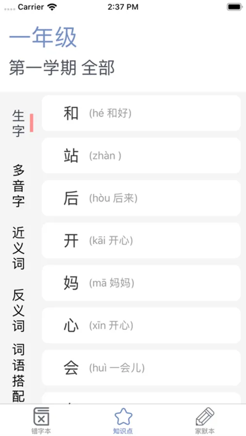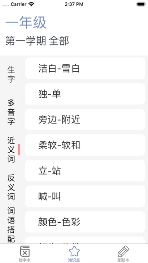 知识库:收录了1-5级重点生字词汇、多音字、近反义词和词语搭配,可以方便的随时查阅学习。