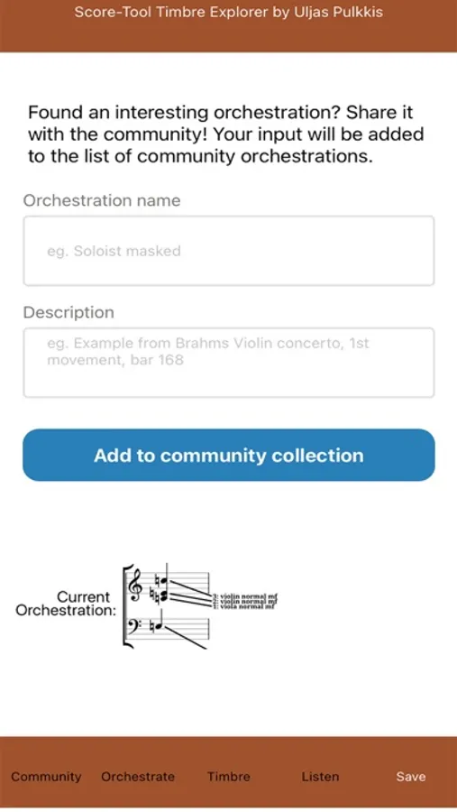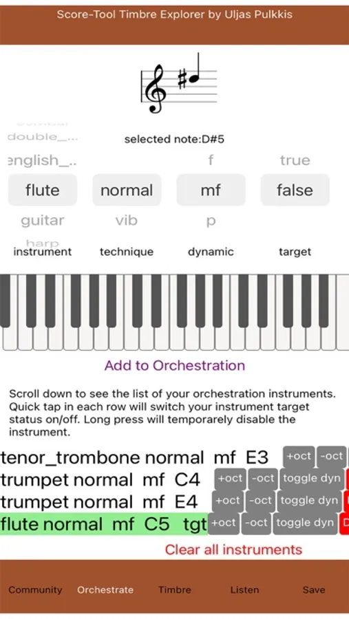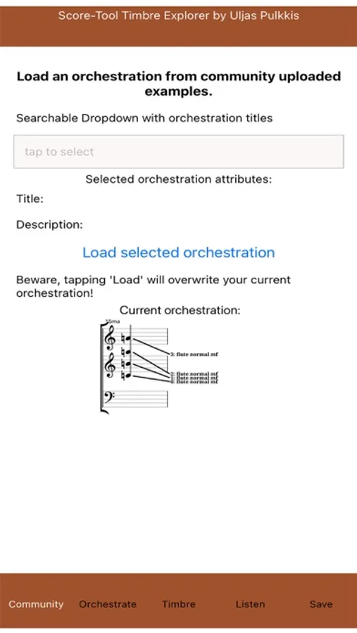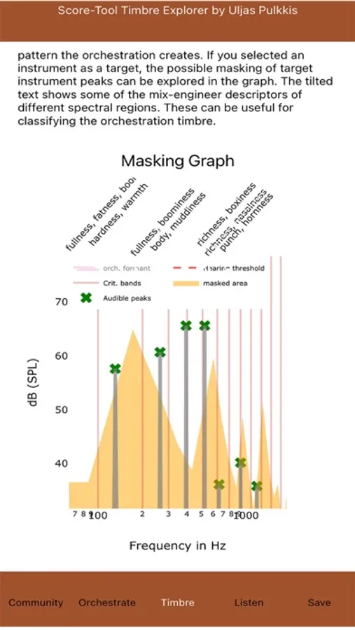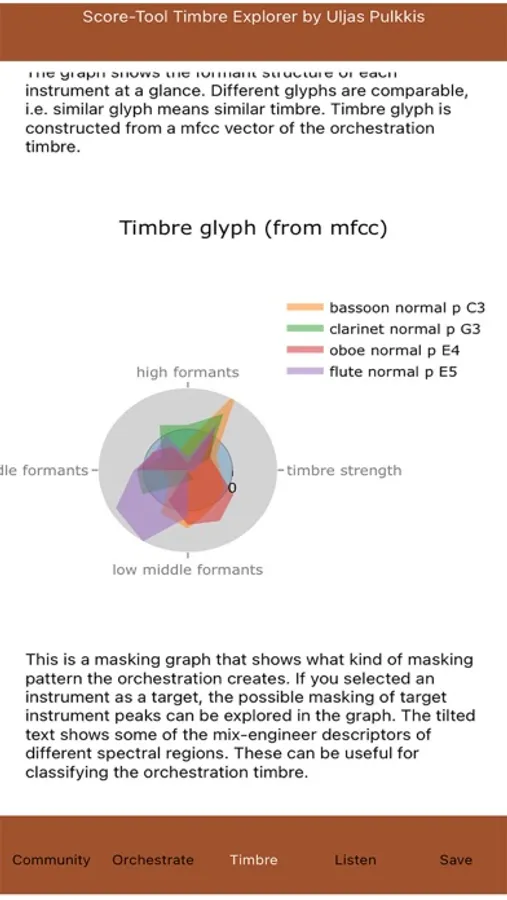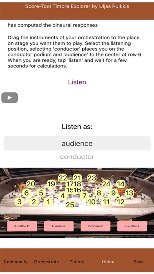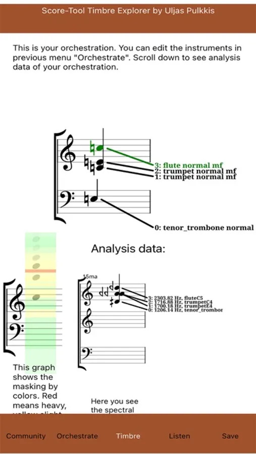 With this app a user can compose an own orchestration consisting of standard symphony orchestra instruments. This orchestration can be explored and analysed with psychoacoustic algorithms, and the data is shown on various graphs. There is also possibility to listen the orchestration in simulated concert hall and to freely place the instruments on stage. The best listening experience comes with headphones.
