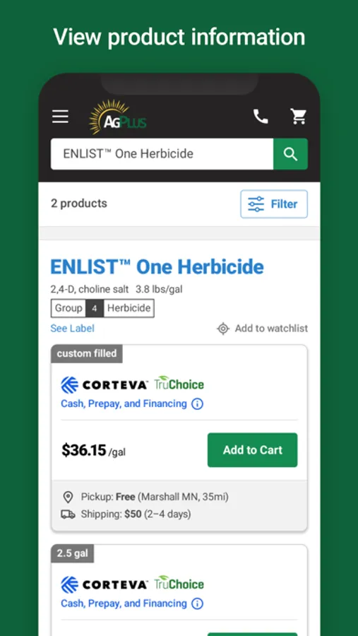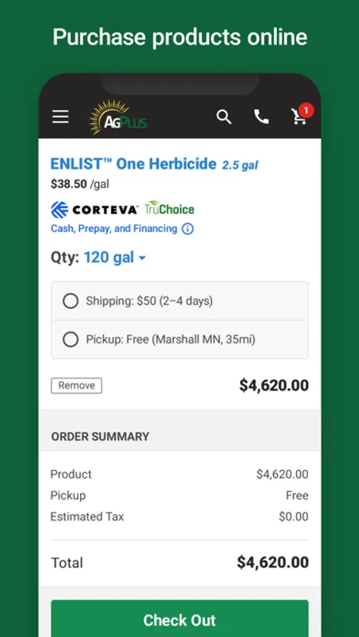 Conveniently purchase the products on your mobile device. Pay using a credit card, ACH, CFA, Corteva TruChoice and other options.