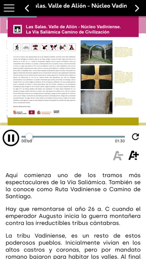 Descubra de una forma accesible la ruta por la Calzada Romana a su paso por Crémenes. A lo largo del recorrido se han dispuesto una serie de paneles informativos y a través de esta app podrá acceder a ellos de una forma accesible. Los vídeos de lengua de signos, las audiodescripciones y los textos de lectura fácil llegarán a todos los públicos para permitir disfrutar de la vista al máximo. Además, desde el menú de la app, podrá acceder a toda la información necesaria de la zona.