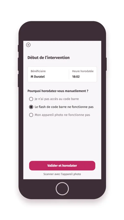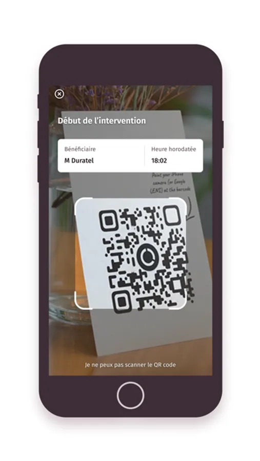 2. Horodatez vos interventions en scannant un code barre avec votre téléphone pour signaler votre arrivée et départ du domicile du bénéficiaire. Votre planning se met à jour automatiquement avec l'heure horodatée.