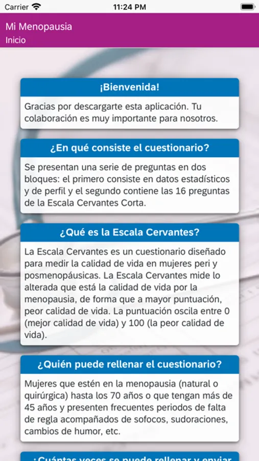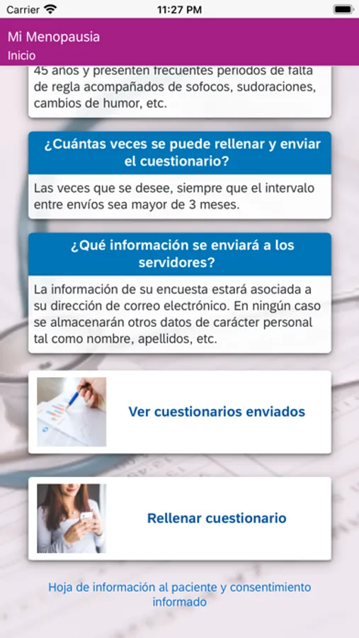 Mi Menopausia es una aplicación diseñada para calcular la calidad de vida de la mujer en la transición a la menopausia. De una forma sencilla usted puede aportar datos relacionados con su salud, síntomas relacionados con la menopausia y sus tratamientos. Además de calcular su calidad de vida relacionada con su salud durante la menopausia usted contribuirá a optimizar y actualizar los valores de referencia españoles de calidad de vida, que serán de utilidad a todas las mujeres españolas que estén en su misma situación.