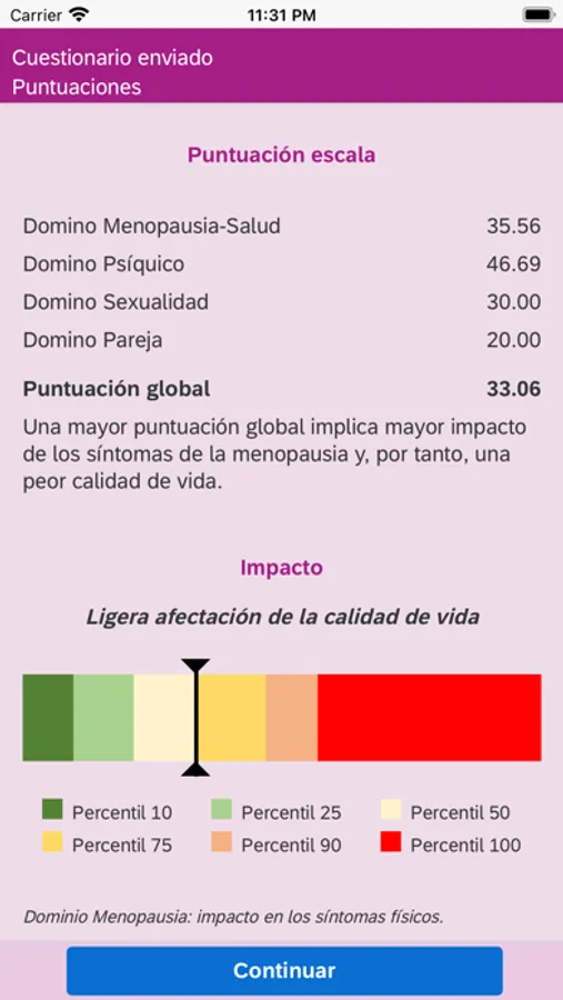 • Resultado del test: en este apartado podrá ver el impacto de sus síntomas sobre su calidad de vida. La puntuación oscilará entre 0 y 100, donde 0 es el mínimo impacto (que significa la mejor calidad de vida) y 100 corresponde al máximo impacto en su calidad de vida (que significa la peor calidad de vida). Se representan varias puntuaciones: la global y por dominios. Los dominios corresponden a las diferentes facetas que pueden verse alteradas durante la transición menopaúsica y son: menopausia y salud (valora los sofocos y síntomas relacionados), esfera psíquica, impacto sobre la sexualidad y relación de pareja.