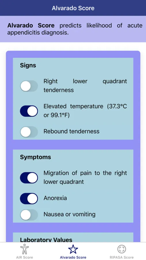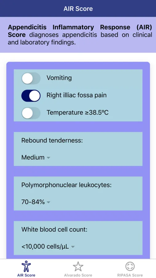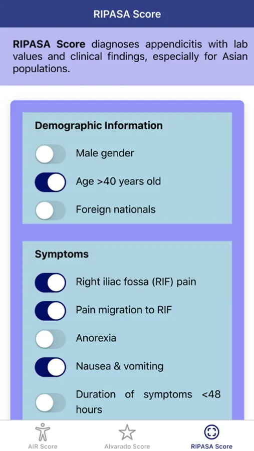 Appendicitis inflammatory response (AIR) score has been used in both paediatric and adult patients with large external validation study. Diagnosis of acute appendicitis with appendicitis inflammatory response (AIR) score is also said to be more superior compared to Alvarado score. Alvarado score also predicts likelihood of appendicitis diagnosis. The Alvarado Score was initially described in 1986 by Dr. Alfredo Alvarado in a retrospective single centre study in Philadelphia. It is one of the most commonly used formula to diagnose appendicitis nowadays. While RIPASA score is similar to both AIR score and Alvarado score. It typically provides a quantitive value for a clinician's clinical gestalt of appendicitis. It has been most widely studied in Asian populations (Singapore, India) and less so in Western populations. In "Pocket Appendicitis Score - AIR, Alvarado, RIPASA Score" app, you can easily predict appendicitis with AIR score, Alvarado score, and RIPASA score.
