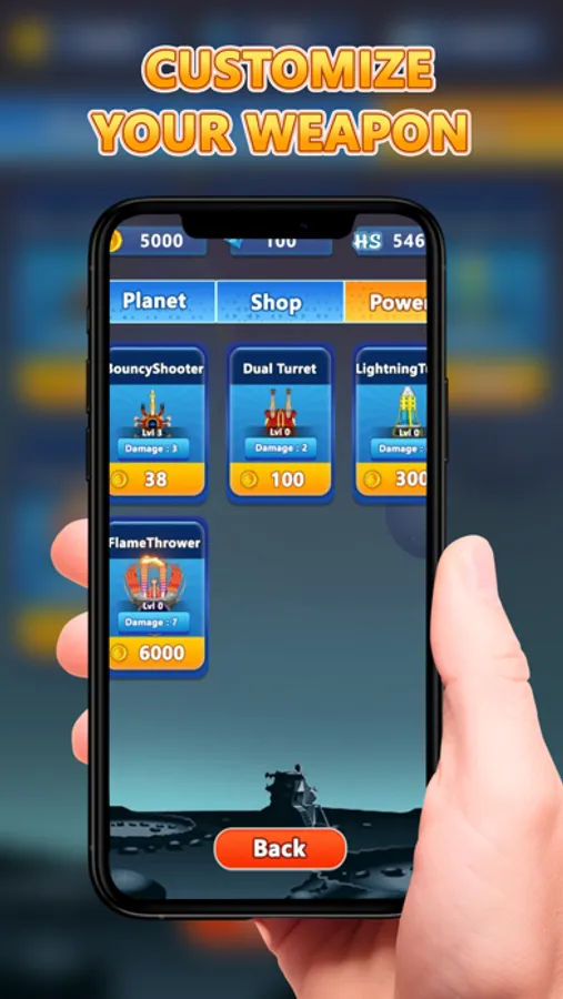 Buy & Upgrade your turrets to improve their Damage, drag them to your planet to equip them