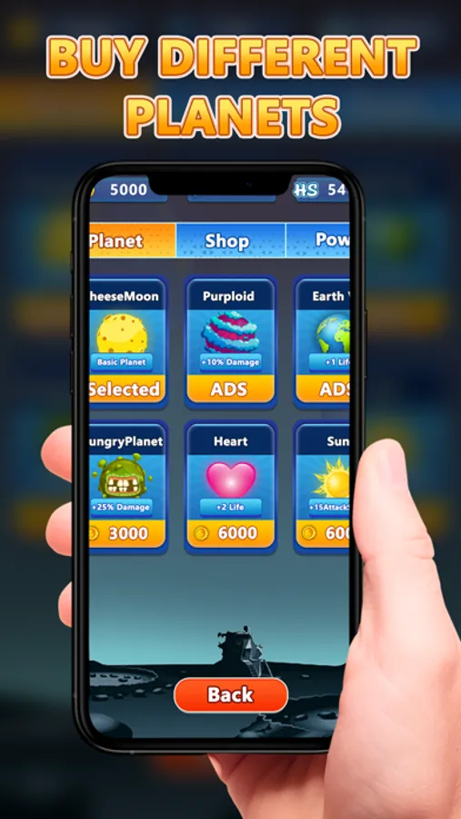 Unlock different planet skins and get their bonuses (+life, +damage, +attack speed)