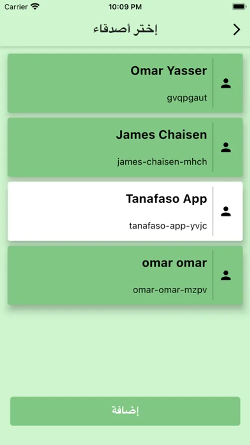 ٣- إذا كنت تعرف كود المستخدم الخاص بصديق، يمكنك الذهاب لصفحة الأصدقاء ثم ضغط زر الزائد ثم ضغط زر الإضافة ثم إدخال كود المستخدم الخاص بصديقك وسيتم إرسال طلب صداقة له.