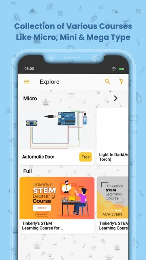 The Explore section of the Let's Tinker App consists of customizable free short courses on coding for kids that are divided into 3 categories- Micro, Mini, & Full Courses.