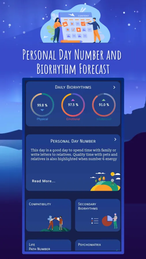 Find your life purpose and path through Numerology, Biorhythm, and Psychomatrix. We provide these calculations and forecast to help you discover yourself and your future. In Numerology and Biorhythm app, we combine our knowledge of human nature and mathematic calculation to find answers for your life’s questions. Download our app now and get forecast, compatibility calculations and many more!