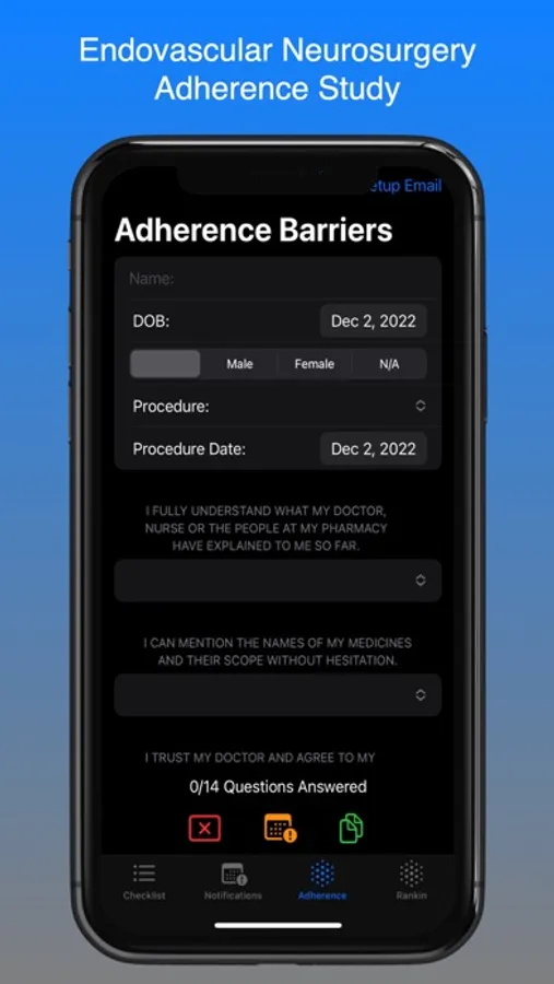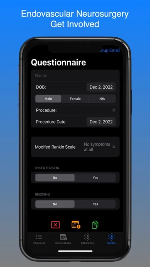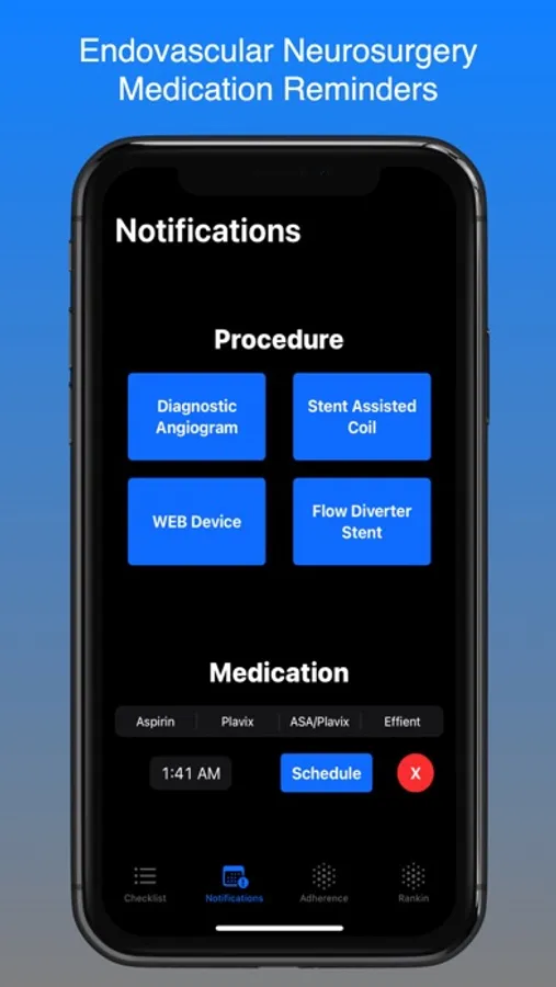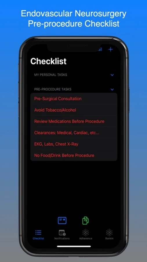 Novel custom surgical notifications to remind patients of their pre-operative care and provide daily reminders to take critical medications to keep the stent/vessel patent. This app is designed to be surgeon specific as well as procedure specific. Patients easily put in the type of operation they are undergoing as well as the date. The app will take care of the rest. It will help make sure patients are reminded to get their all appropriate testing as well as not eat or drink the night before their operation. Also, there is a checklist that users can populate as well as pre-populated items for their care.